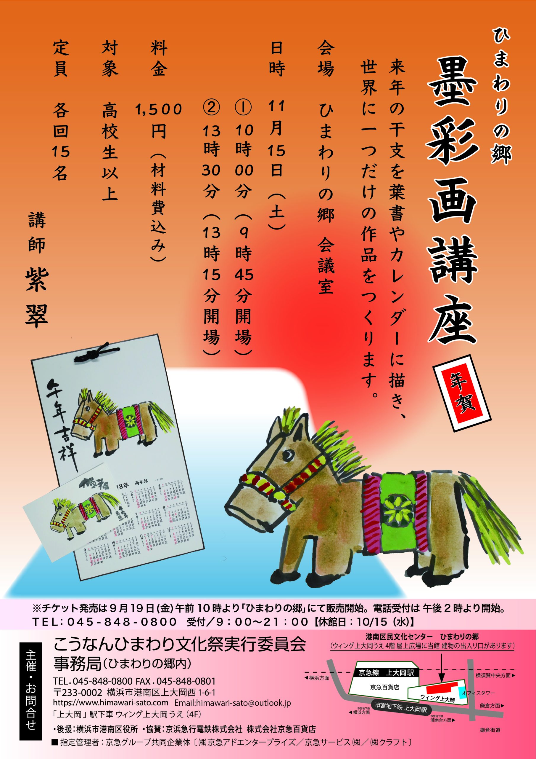 お待たせしました!!大好評の墨彩画講座、 今回は葉書(年賀ハガキ)やカレンダーに来年の干支🐎を描きます!! チケットはひまわりの郷にて発売中です🐴🌅 〈日時〉11/15(土)①10:00 開始 ②13:30 開始 …