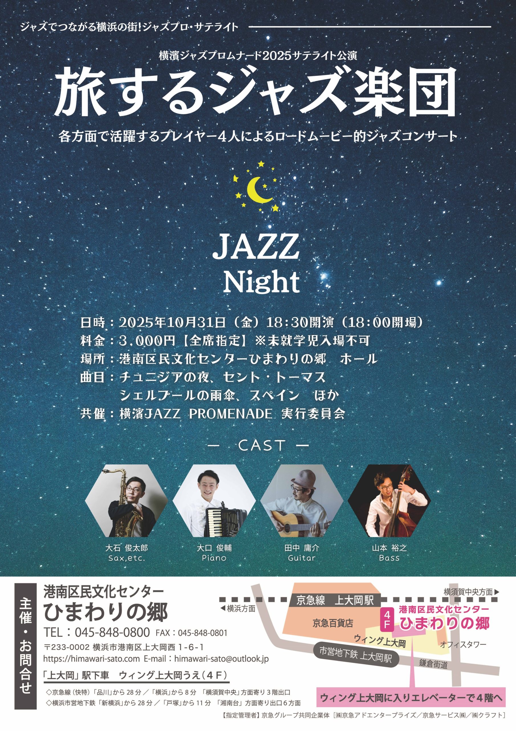 ■横濱ジャズプロムナード2025サテライト公演■ 旅するジャズ楽団 各方面で活躍するプレイヤー4人によるロードムービー的コンサート 公演日時:2025年10月31日(金) 18:30開演(18:00開場) ※ひまわり通信…
