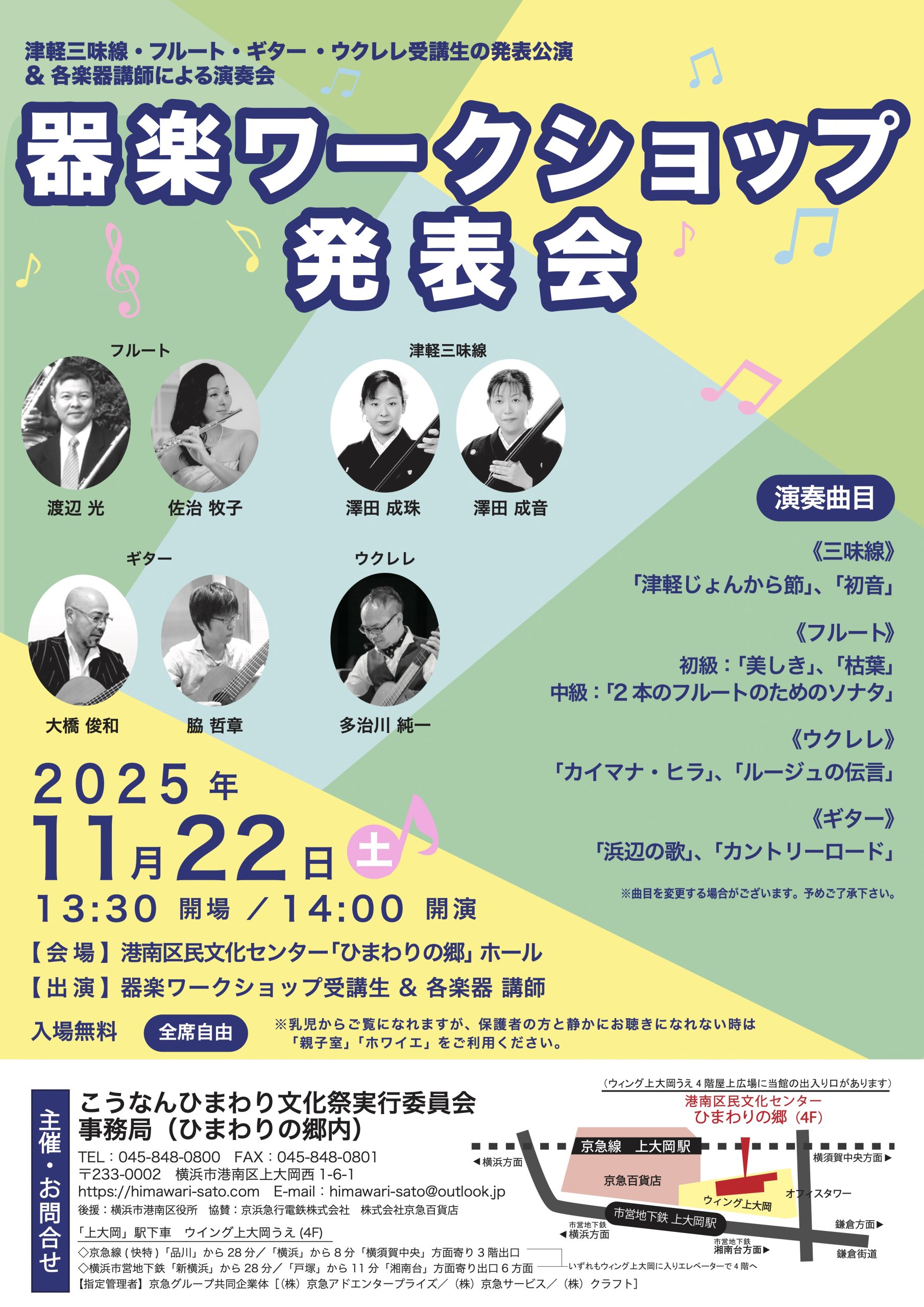 今年度6月より計10回の器楽ワークショップを受講された方の成果発表会。講師と共にステージに立ちます。 〈出演〉器楽WS フルート、三味線、ギター、ウクレレ 講師・生徒一同 〈日時〉2025年11月22日(土)14:00開…
