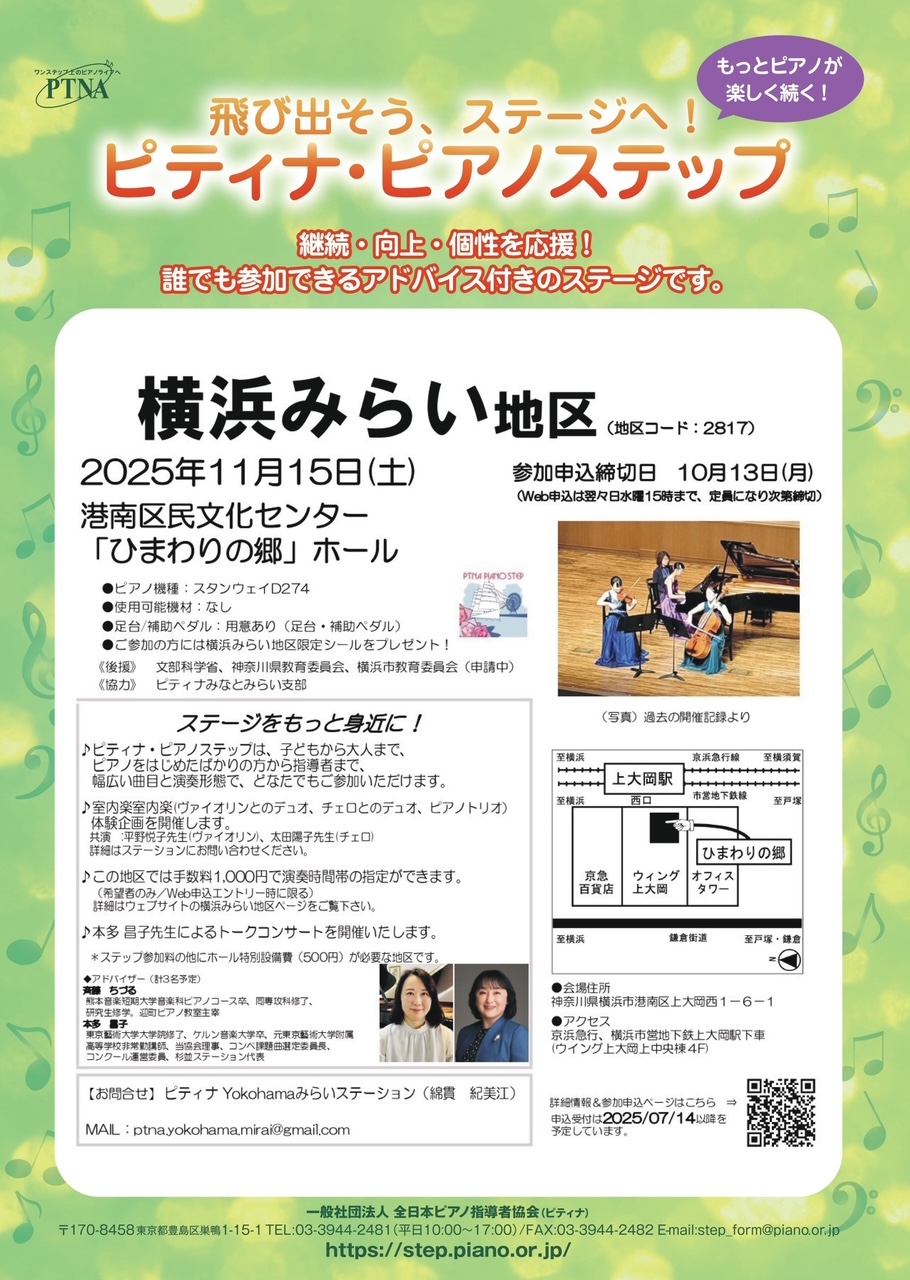 11/15(土) 10:00開演 内容:ピアノ演奏 料金:無料全席自由 お問い合わせ:ピティナ Yokohama みらいステーション 綿貫☎090-8035-0477