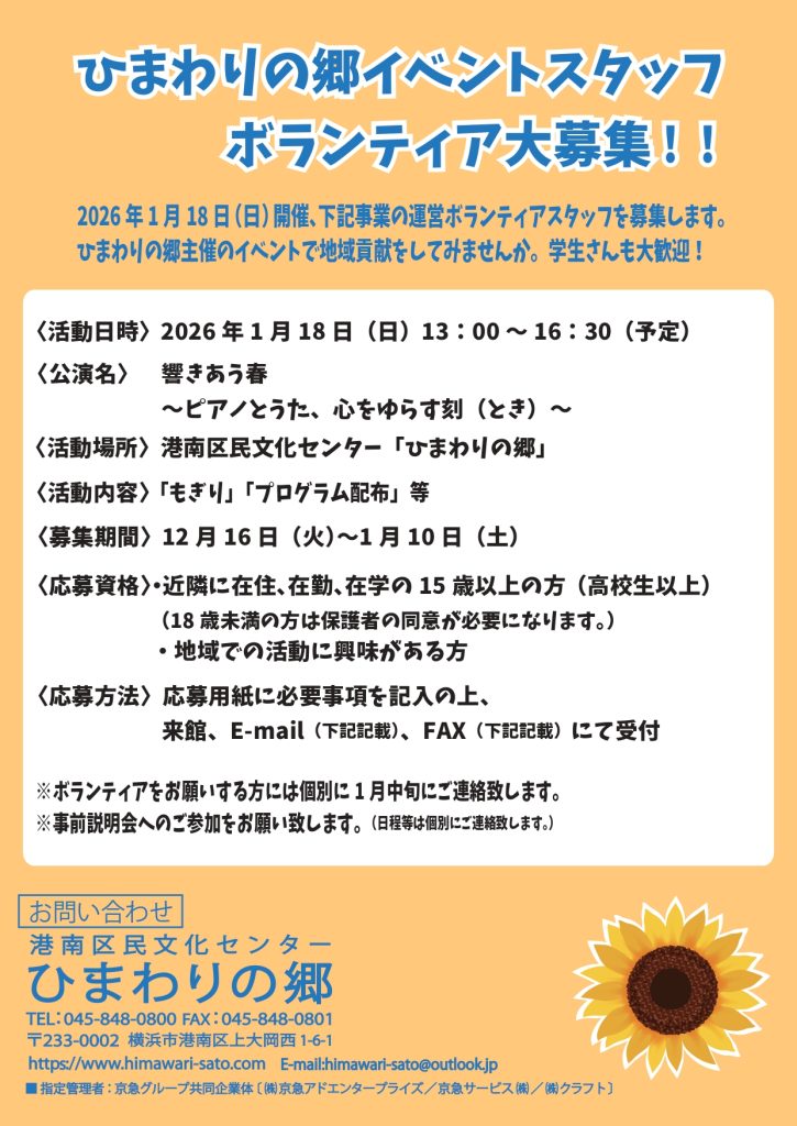 12月16日(火)~ひまわりの郷イベントスタッフボランティア募集!