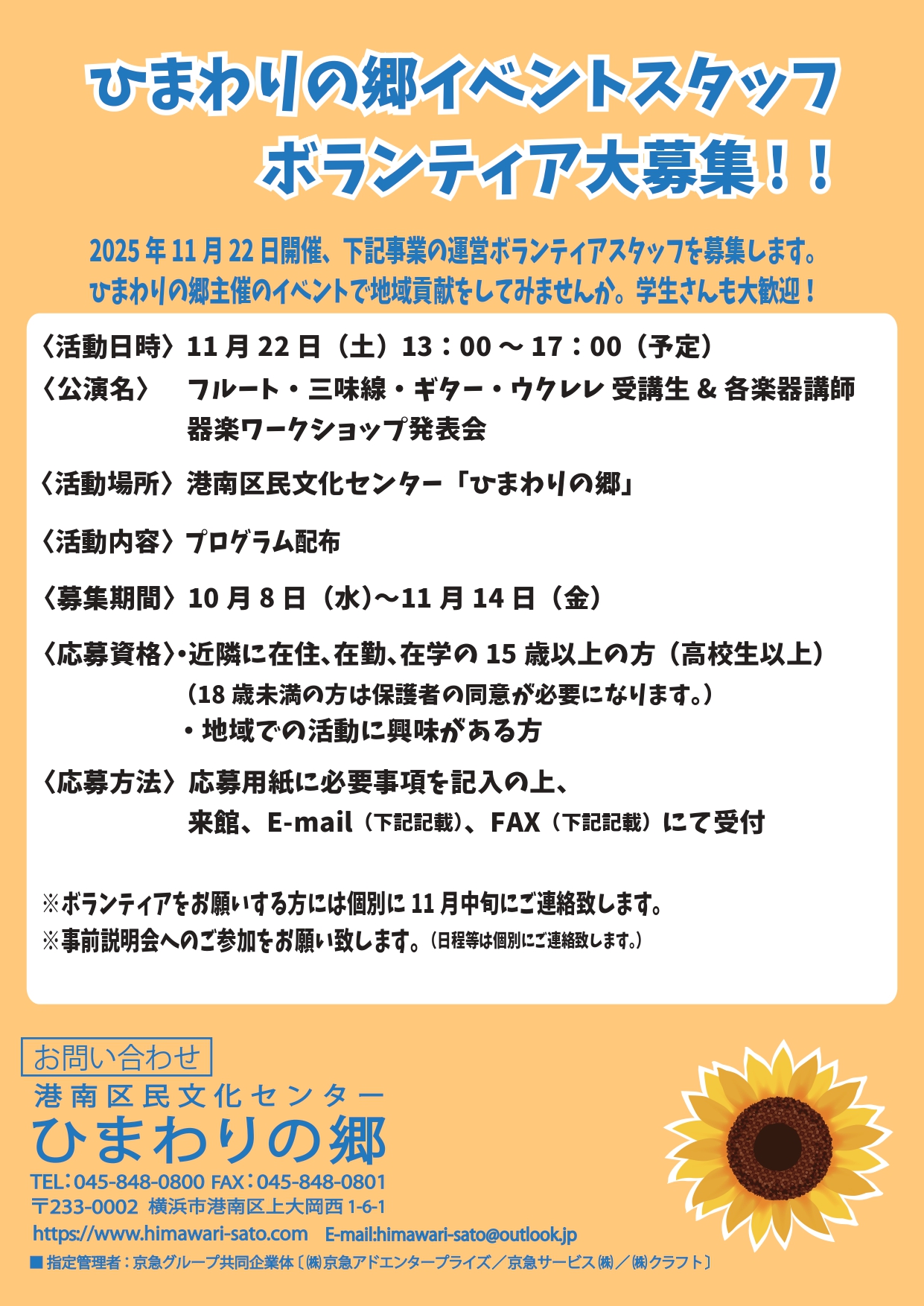 【事業内容】ひまわりジョイントコンサート 【募集期間】10月1日(水)~ 【応募資格】・近隣に在住、在勤、在学の15 歳以上の方(高校生以上) ( 18 歳未満の方は保護者の同意が必要になります。) …