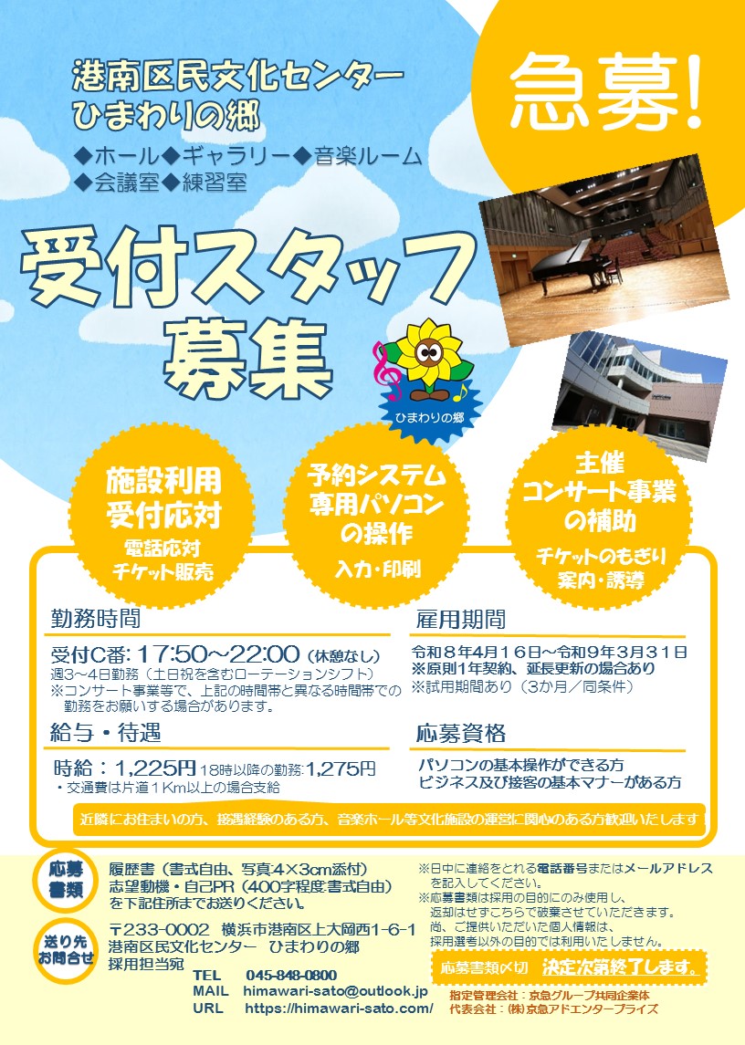 日頃より港南区民文化センターひまわりの郷をご利用いただき誠にありがとうございます。 同日台風の接近が見込まれております。現状では通常通り開館予定ですが、今後の台風の進路・規模・警報等によってはご利用できない場合があります…
